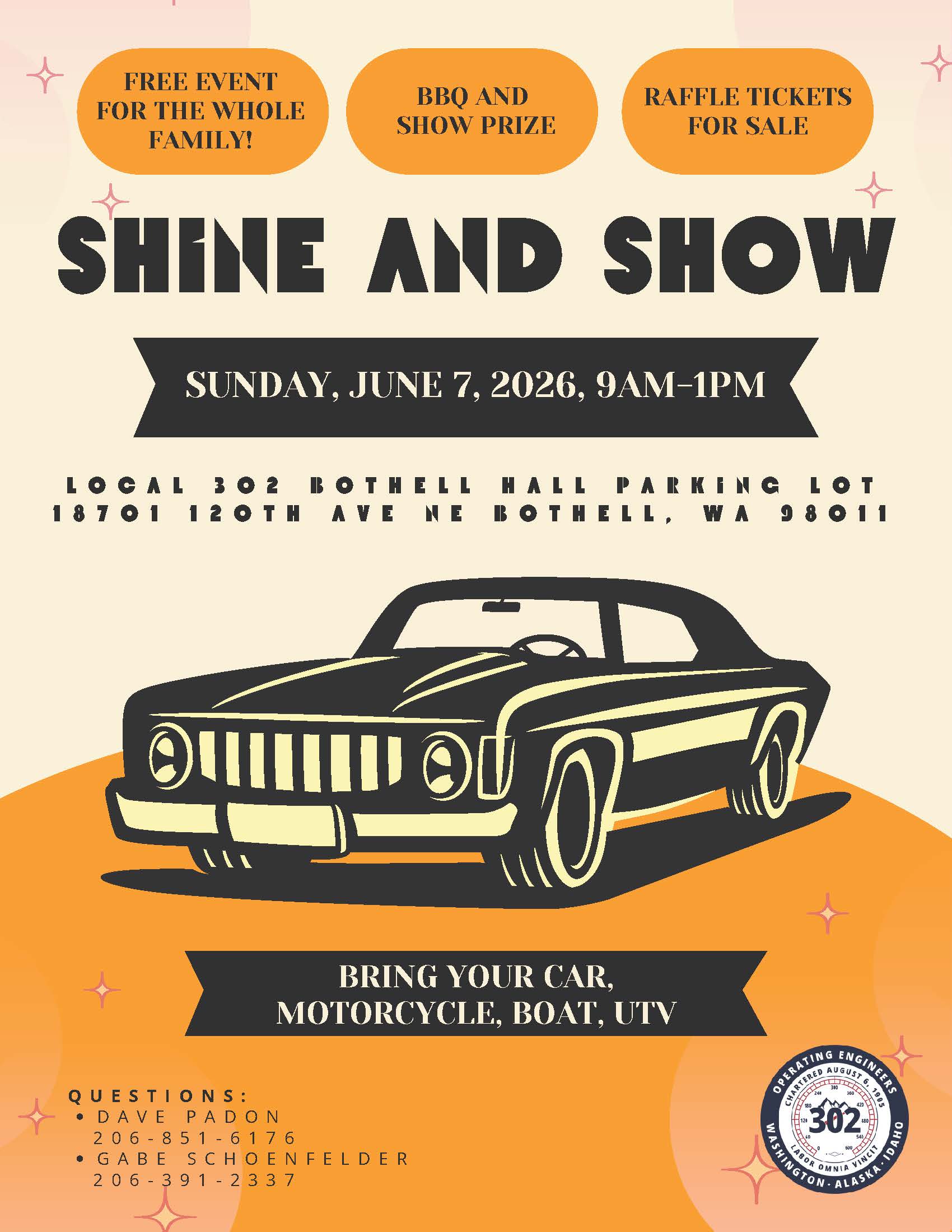 Save the date for the annual Local 302 Shine and Show, Sunday, June 7, 2026! The event will take place at the Bothell Hall located at 18701 120th Ave NE Bothell, WA 98011.
